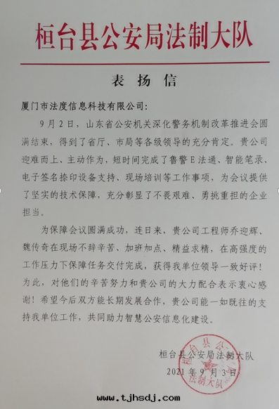 会(huì)後(hòu),桓台(tái)縣(xiàn)公(gōng)安(ān)局(jú)法(fǎ)制大隊第(dì)一(yī)时(shí)間(jiān)給(gěi)法(fǎ)度(dù)信(xìn)息公(gōng)司發(fà)来(lái)了(le)感(gǎn)謝信(xìn),並(bìng)表(biǎo)达(dá)了(le)希望與(yǔ)公(gōng)司长(cháng)期(qī)發(fà)展(zhǎn)合作(zuò)的(de)期(qī)望: