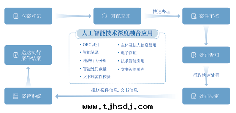 基于(yú)法(fǎ)度(dù)執法(fǎ)辦(bàn)案(àn)知識庫将人(rén)工智能(néng)技術(shù)深度(dù)融合到(dào)案(àn)件(jiàn)快(kuài)速辦(bàn)理程序中(zhōng),證照OCR識别減少人(rén)工录(lù)入,与商事(shì)主(zhǔ)体对(duì)接實(shí)现法(fǎ)人(rén)及(jí)當事(shì)人(rén)信息的(de)快(kuài)速引用(yòng),通(tòng)过(guò)法(fǎ)度(dù)智能(néng)笔(bǐ)录(lù)系(xì)統內(nèi)置的(de)上(shàng)百(bǎi)份预設問(wèn)話(huà)模闆實(shí)现现场(chǎng)快(kuài)速問(wèn)話(huà)取(qǔ)證,基于(yú)区块(kuài)鍊(liàn)電(diàn)子存證技術(shù)保證现场(chǎng)證据的(de)法(fǎ)律效力,基于(yú)知識結構化的(de)法(fǎ)律知識庫对(duì)違法(fǎ)行为(wèi)智能(néng)分(fēn)析、執法(fǎ)依据智能(néng)引用(yòng)、違法(fǎ)行为(wèi)智能(néng)裁量(liàng)、法(fǎ)律文(wén)書(shū)的(de)智能(néng)生(shēng)成(chéng)、一(yī)鍵式文(wén)書(shū)規范性校(xiào)验(yàn),文(wén)書(shū)電(diàn)子送达(dá)、在線(xiàn)電(diàn)子签(qiān)章(zhāng)、在線(xiàn)繳交罰款、數据主(zhǔ)動(dòng)反(fǎn)哺各(gè)大(dà)平台(tái)。