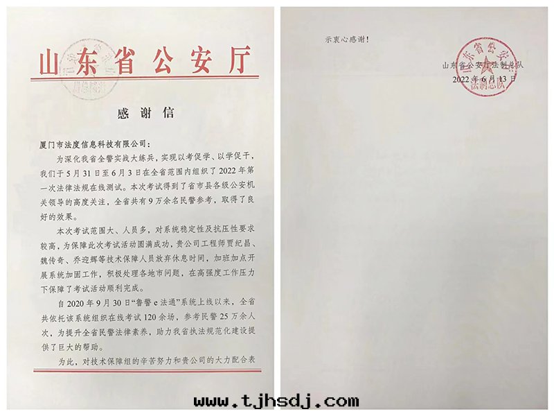 近期(qī),山(shān)東(dōng)省(shěng)为(wèi)深化(huà)全(quán)警實(shí)战大練兵,實(shí)現(xiàn)以(yǐ)考促學(xué)、以(yǐ)學(xué)促干(gàn),在(zài)全(quán)省(shěng)範圍內(nèi)組織了(le)一(yī)次法(fǎ)律法(fǎ)規在(zài)線(xiàn)測試,全(quán)省(shěng)9万(wàn)多(duō)名(míng)民(mín)警參加測試,取(qǔ)得了(le)良好(hǎo)的(de)效果(guǒ)。法(fǎ)度(dù)信(xìn)息相關(guān)人(rén)員應(yìng)急響應(yìng)及(jí)时(shí),措施保障得力,在(zài)高(gāo)強(qiáng)度(dù)工作(zuò)壓力下保障考試活動(dòng)順利完成(chéng),山(shān)東(dōng)省(shěng)公(gōng)安(ān)厅为(wèi)此發(fà)来(lái)感(gǎn)謝信(xìn)。