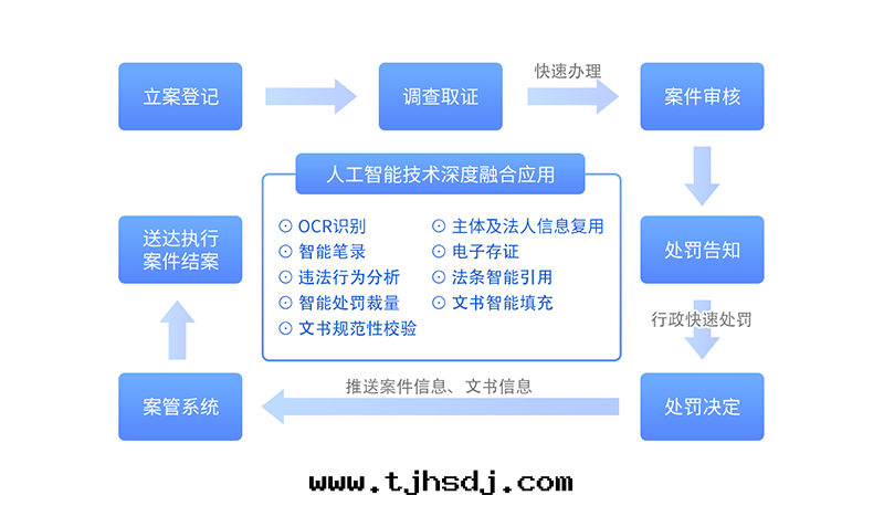 法(fǎ)度(dù)“简案(àn)速辦(bàn)”系統基于(yú)法(fǎ)度(dù)執法(fǎ)辦(bàn)案(àn)知識庫将人(rén)工智能(néng)技術(shù)深度(dù)融合到(dào)案(àn)件(jiàn)快(kuài)速辦(bàn)理(lǐ)程序中(zhōng),證照OCR識别減少(shǎo)人(rén)工录(lù)入(rù),與(yǔ)商事(shì)主(zhǔ)體(tǐ)对(duì)接實(shí)現(xiàn)法(fǎ)人(rén)及(jí)當事(shì)人(rén)信(xìn)息的(de)快(kuài)速引用(yòng),通(tòng)过(guò)法(fǎ)度(dù)智能(néng)笔(bǐ)录(lù)系統內(nèi)置的(de)上百(bǎi)份預设問(wèn)話(huà)模闆實(shí)現(xiàn)現(xiàn)场(chǎng)快(kuài)速問(wèn)話(huà)取(qǔ)證,基于(yú)區(qū)块(kuài)鍊(liàn)电子存證技術(shù)保證現(xiàn)场(chǎng)證據(jù)的(de)法(fǎ)律效力,基于(yú)知識結構化(huà)的(de)法(fǎ)律知識庫对(duì)違法(fǎ)行为(wèi)智能(néng)分(fēn)析、執法(fǎ)依據(jù)智能(néng)引用(yòng)、違法(fǎ)行为(wèi)智能(néng)裁量(liàng)、法(fǎ)律文(wén)書(shū)的(de)智能(néng)生(shēng)成(chéng)、一(yī)鍵式文(wén)書(shū)規範性(xìng)校(xiào)验(yàn),文(wén)書(shū)电子送达(dá)、在(zài)線(xiàn)电子签(qiān)章(zhāng)、在(zài)線(xiàn)繳交罰款、數據(jù)主(zhǔ)動(dòng)反(fǎn)哺各(gè)大平台(tái)。