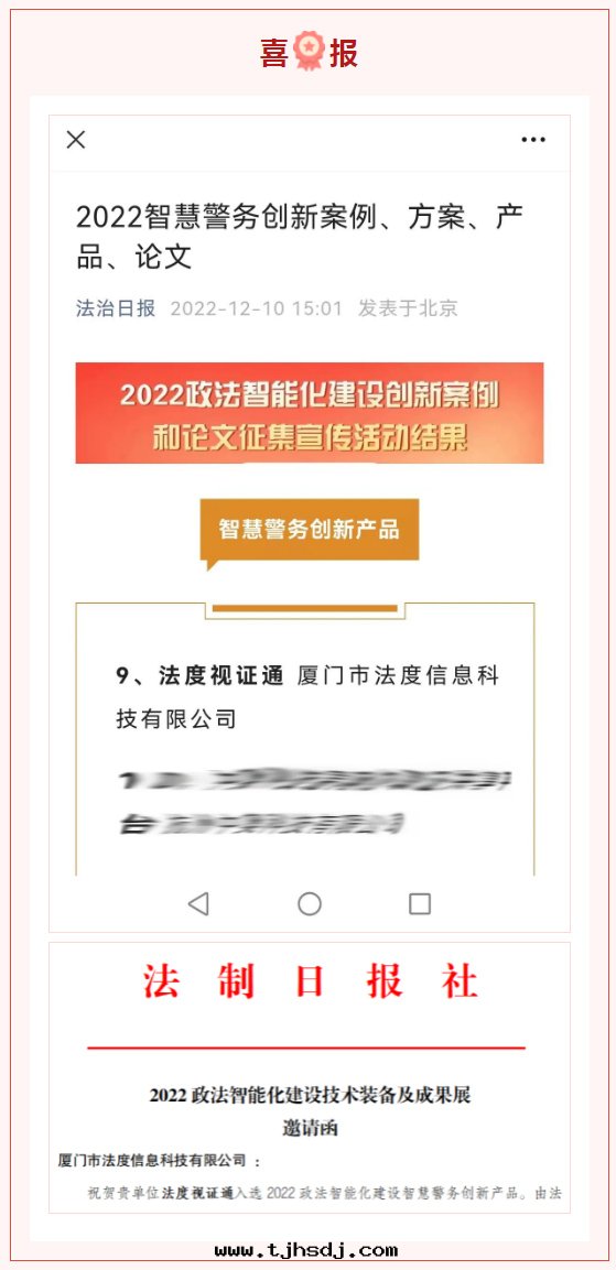 近日(rì),由中(zhōng)央政(zhèng)法(fǎ)委機(jī)關(guān)報《法(fǎ)治日(rì)報》主(zhǔ)辦(bàn)的(de)“2022政(zhèng)法(fǎ)智能(néng)化(huà)建设創新(xīn)案(àn)例和論文(wén)征集活動(dòng)”結果(guǒ)公(gōng)布(bù),廈門(mén)市(shì)法(fǎ)度(dù)信(xìn)息科技有(yǒu)限公(gōng)司自(zì)主(zhǔ)研發(fà)的(de)“法(fǎ)度(dù)視證通(tòng)”系統獲得了(le)“智慧警务創新(xīn)産品獎”,这(zhè)是(shì)繼2019年、2021年以(yǐ)来(lái)法(fǎ)度(dù)旗(qí)下智能(néng)執法(fǎ)系列的(de)又一(yī)个(gè)産品獲此殊榮。