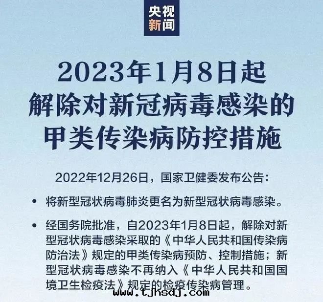 經(jīng)國(guó)务院(yuàn)批準,自(zì)2023年1月(yuè)8日(rì)起(qǐ),解(jiě)除对(duì)新(xīn)型冠狀病毒感(gǎn)染采取(qǔ)的(de)《中(zhōng)華人(rén)民(mín)共(gòng)和國(guó)傳染病防治法(fǎ)》規定(dìng)的(de)甲類(lèi)傳染病預防、控制措施;新(xīn)型冠狀病毒感(gǎn)染不(bù)再纳入(rù)《中(zhōng)華人(rén)民(mín)共(gòng)和國(guó)國(guó)境衛生(shēng)檢疫法(fǎ)》規定(dìng)的(de)檢疫傳染病管(guǎn)理(lǐ)。